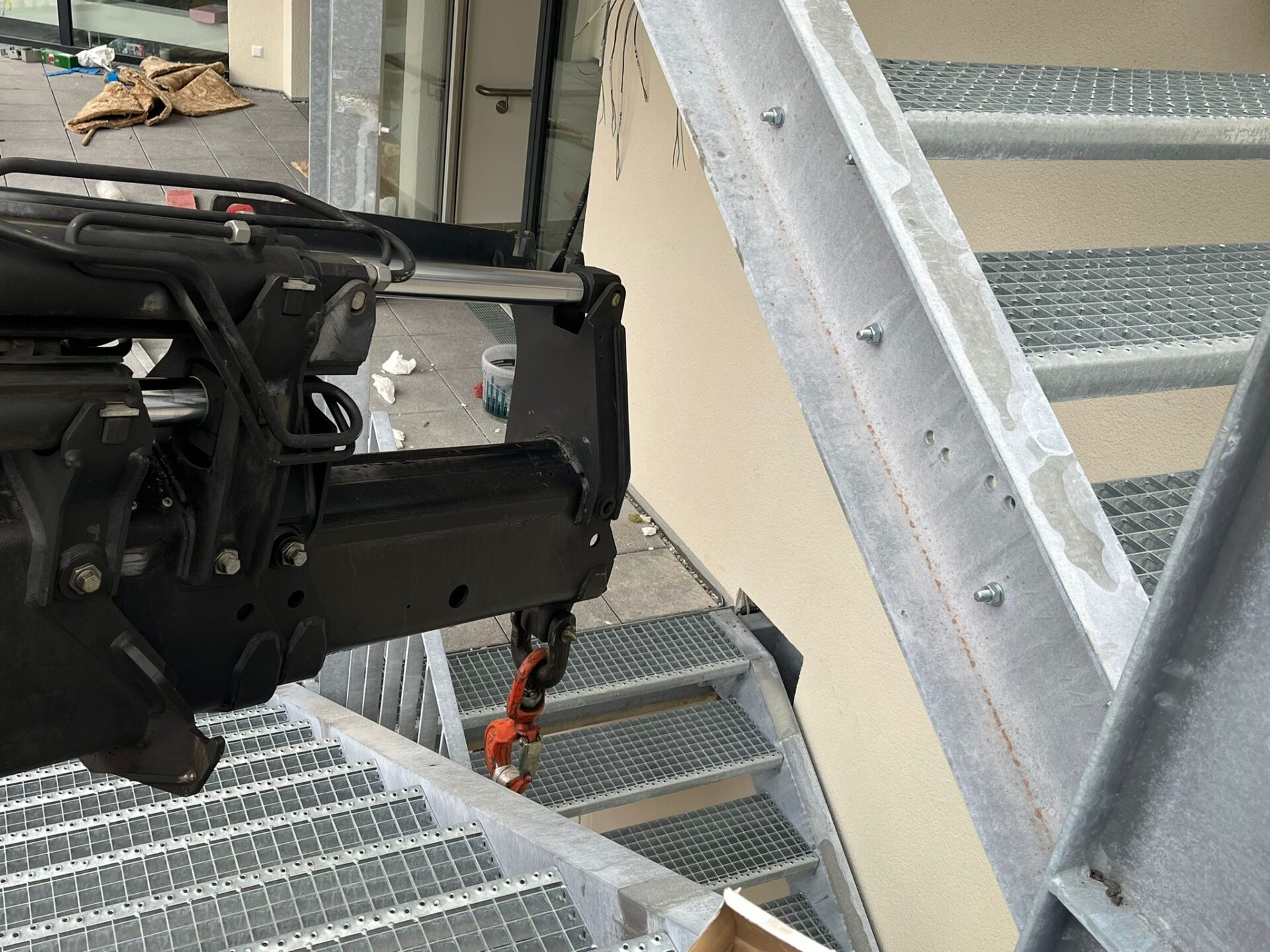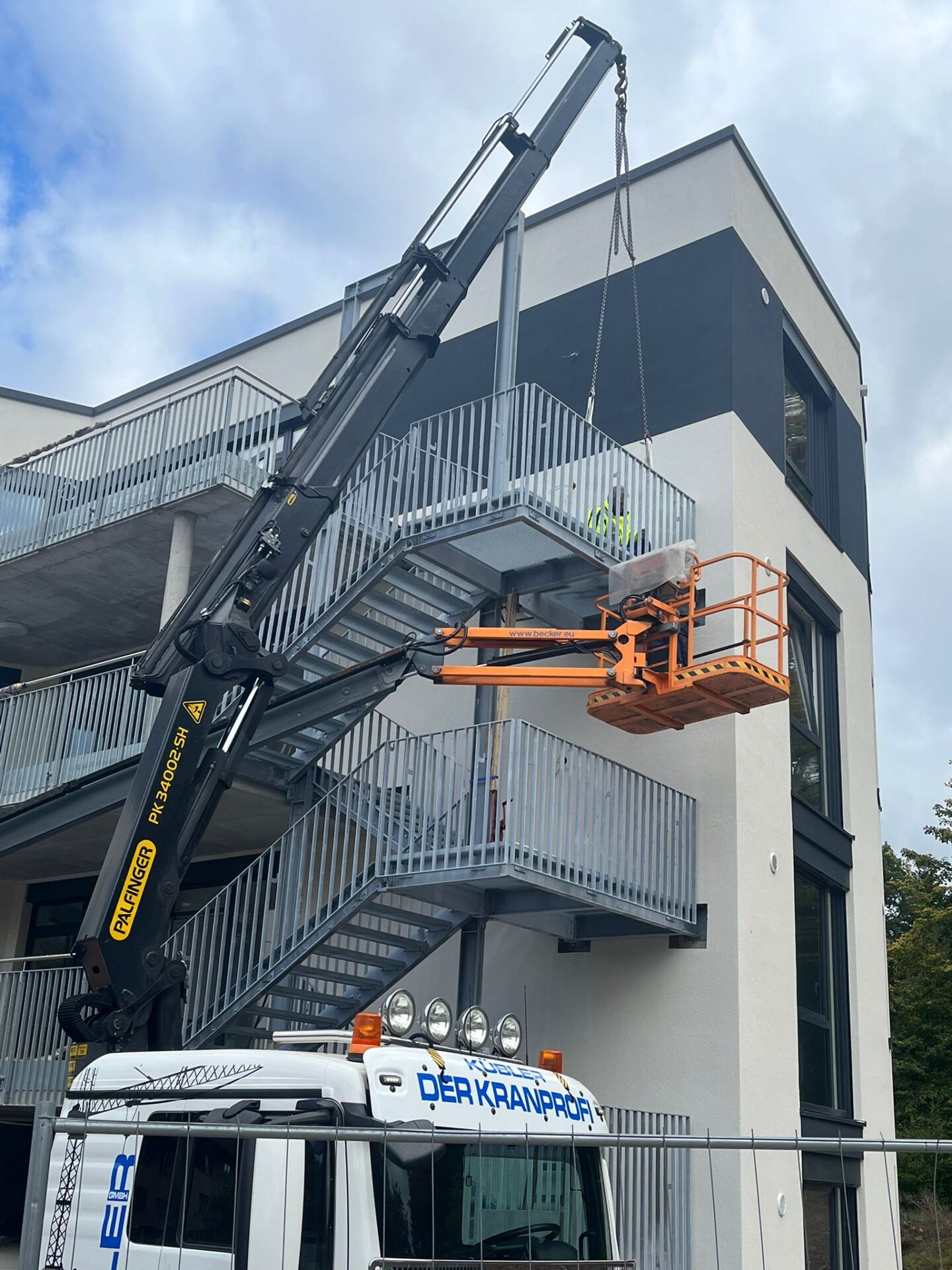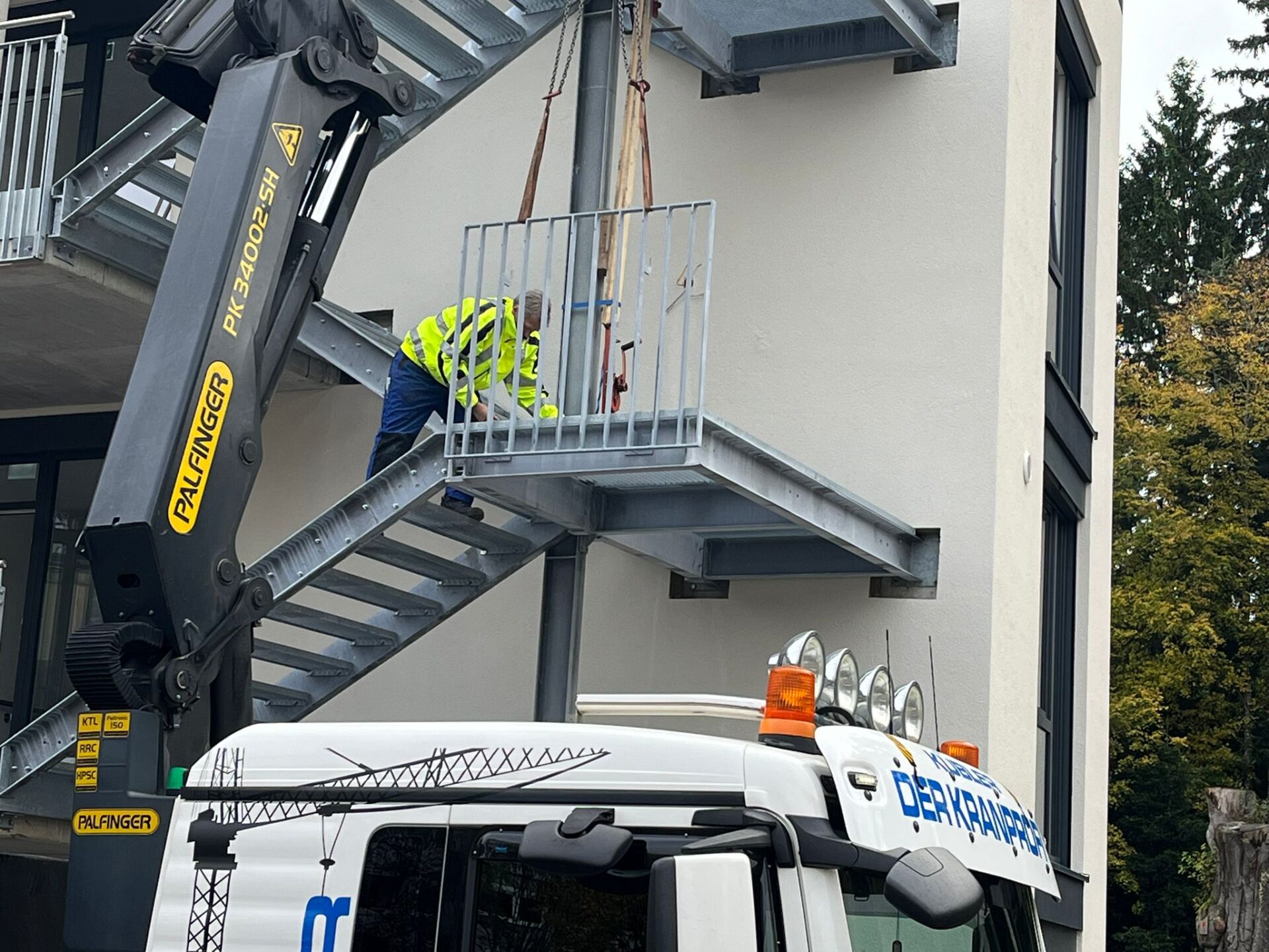 Tag 2. der Hebearbeiten, Fluchttreppe im Pflegeheim