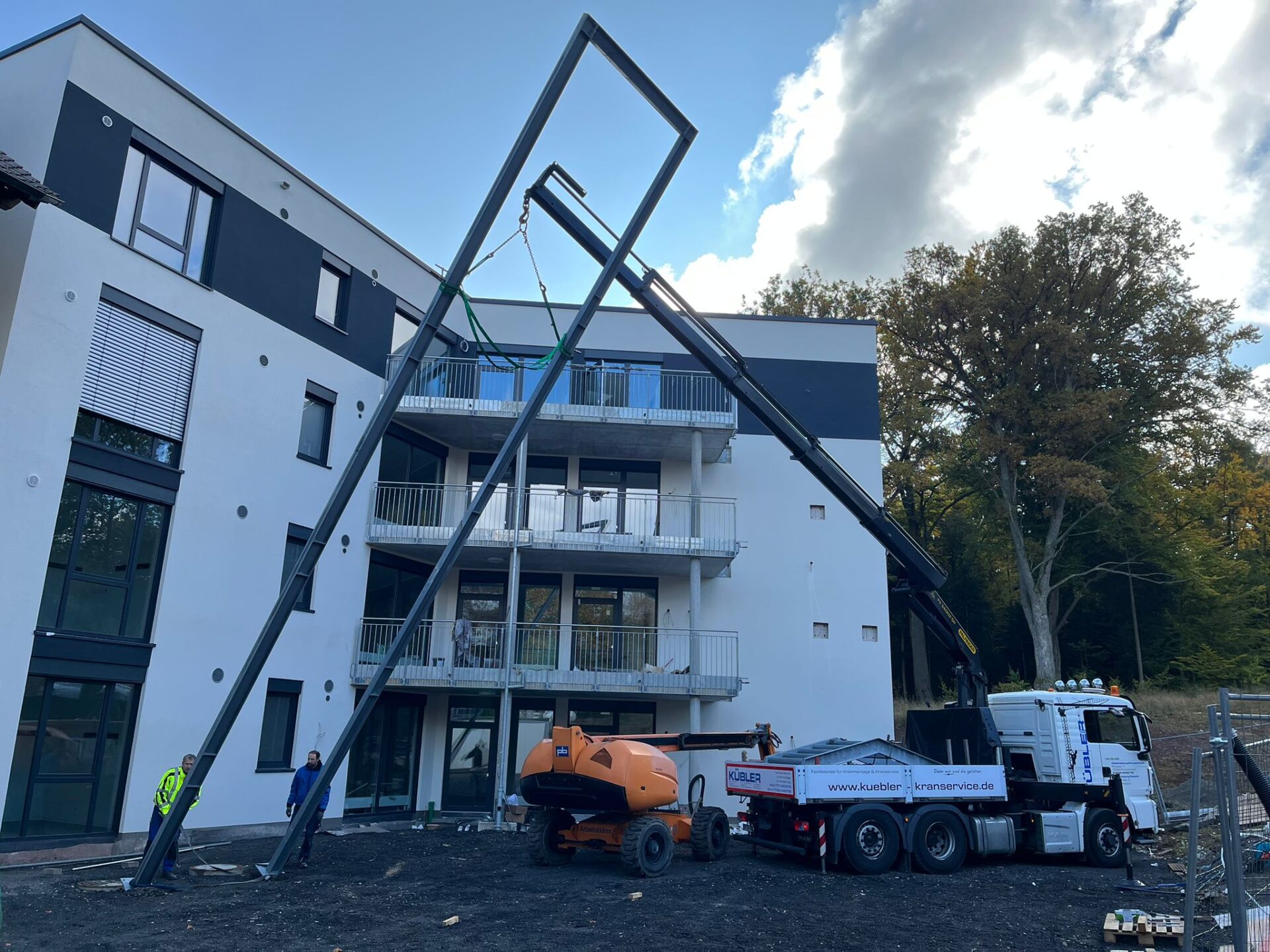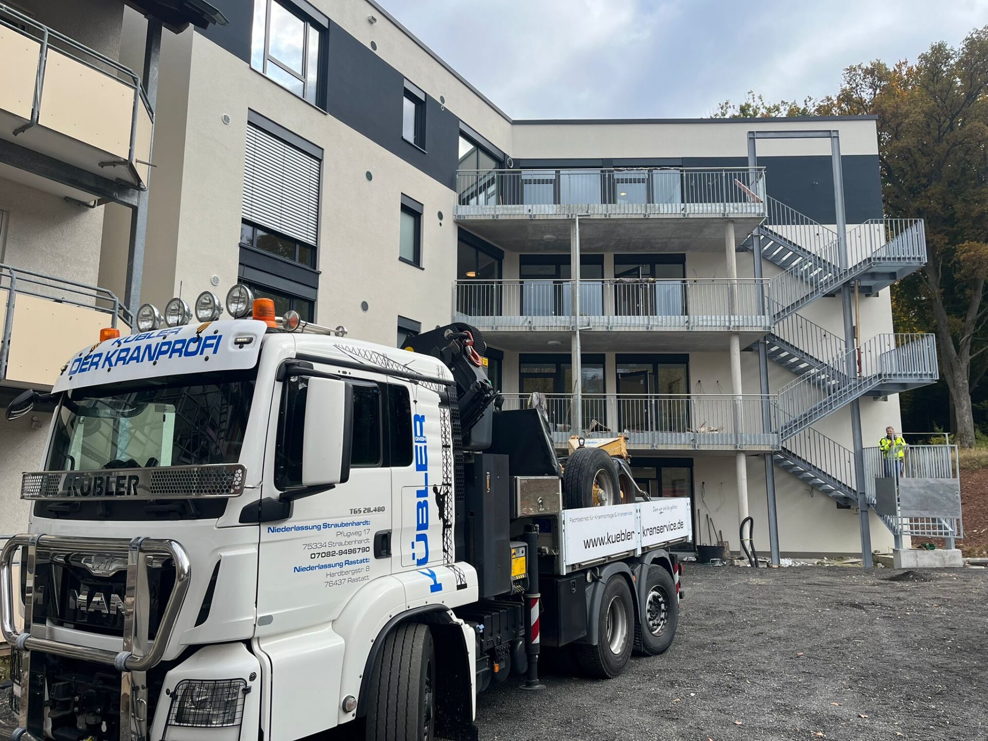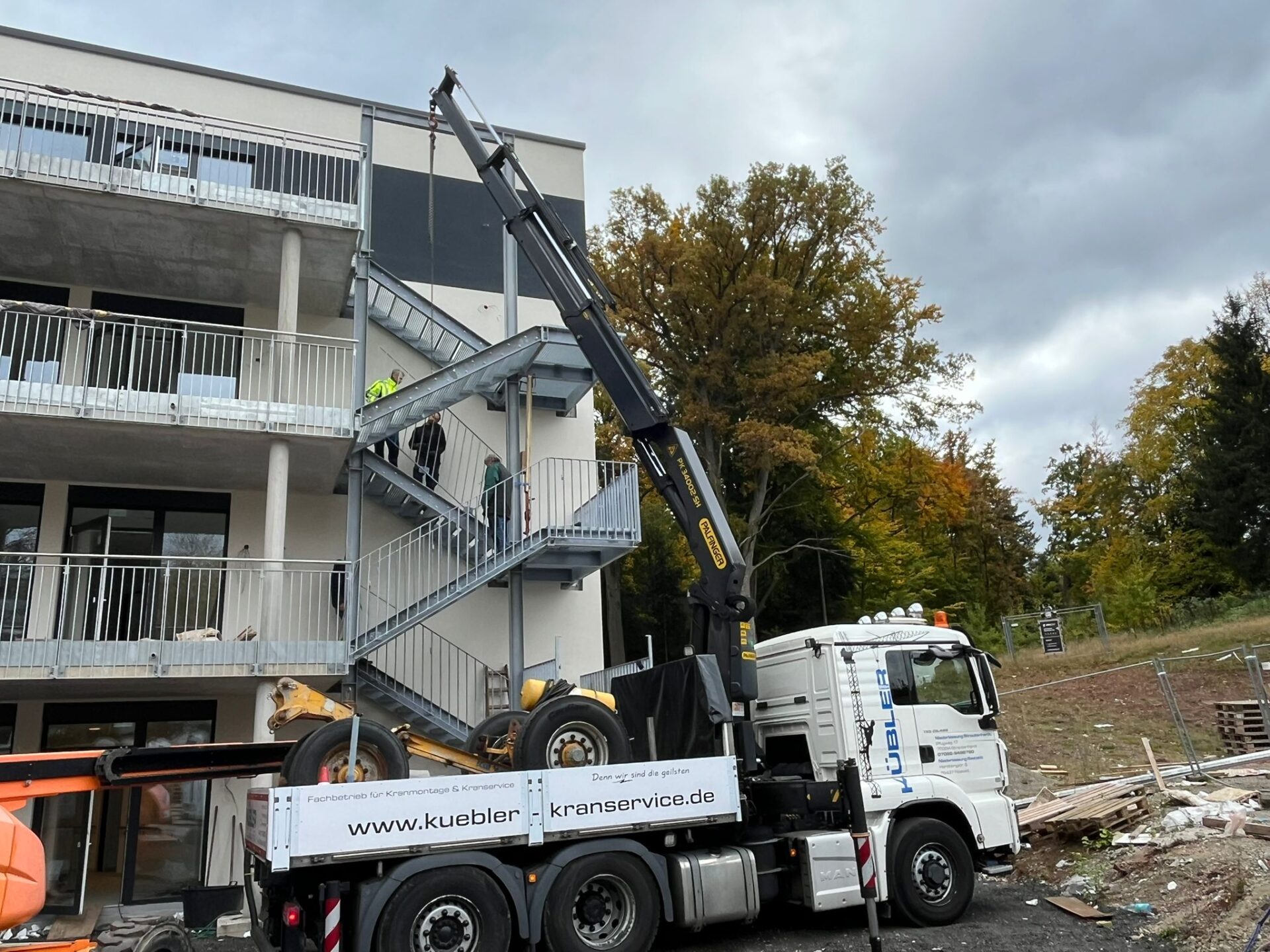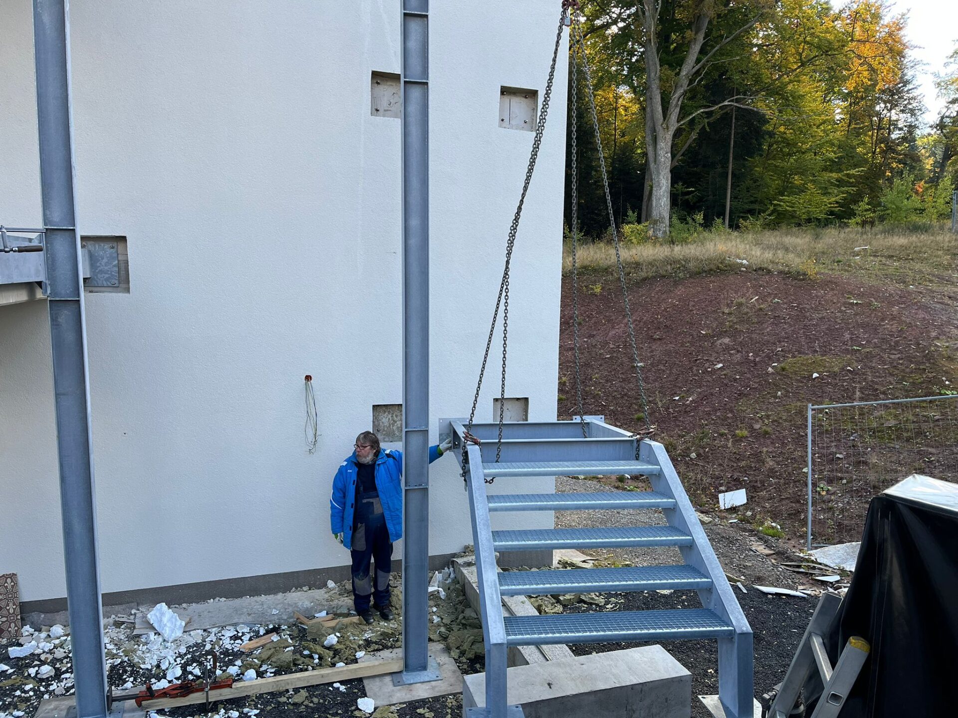 Tag 2. der Hebearbeiten, Fluchttreppe im Pflegeheim