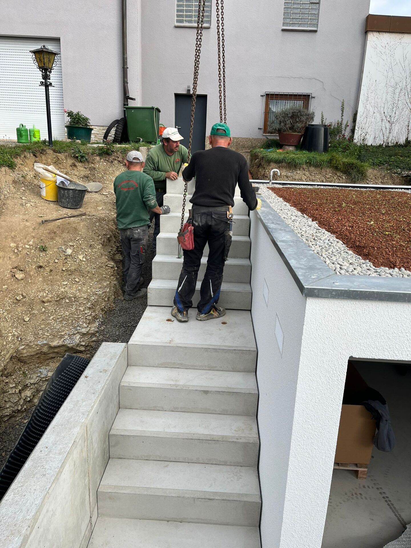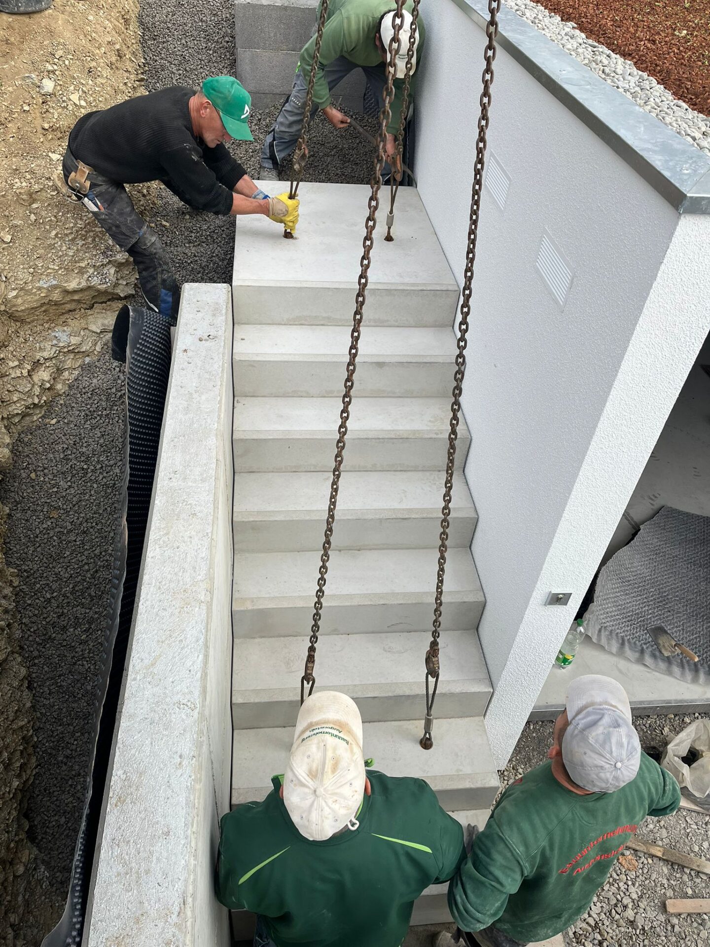 Heute noch kurz paar Tonne Splitt verfüllt und anschließend zwei schöne Sichtbeton- Treppen gesetzt.